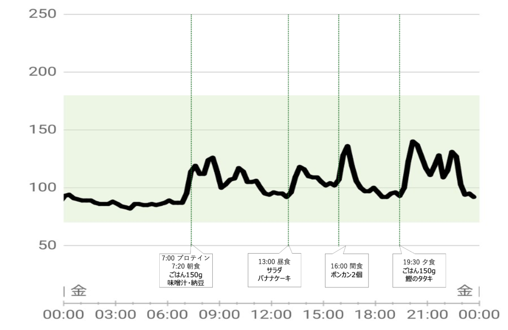 やはり、食べる順番はとっても大事なようで、ランチが甘いバナナケーキでも、事前にゆで卵と生野菜を食べておくと血糖上昇は非常に緩やか。間食のポンカンも爆上がりではなく。