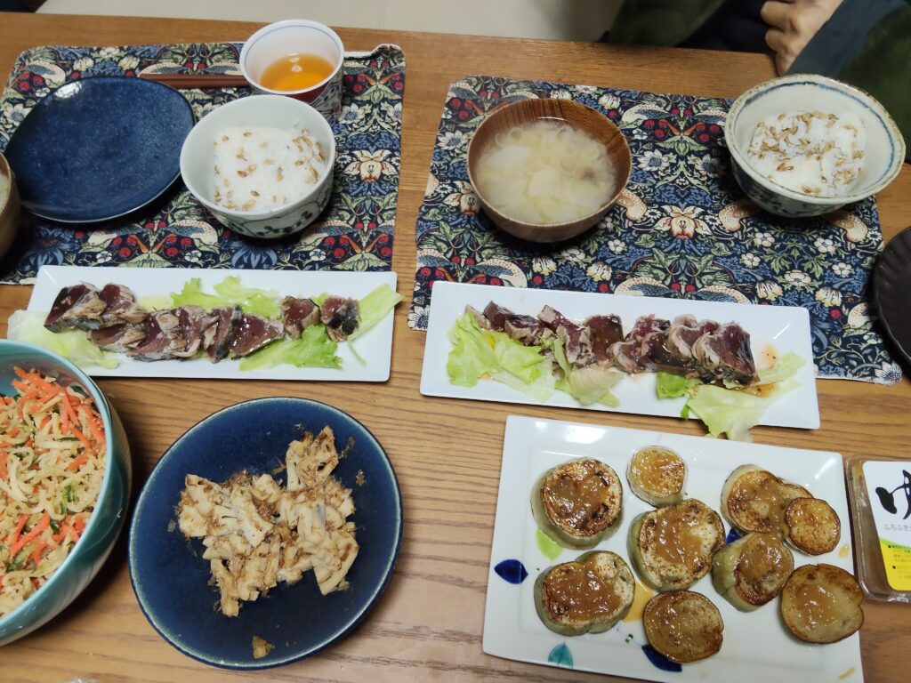 夕ご飯は、頂き物の柚子味噌を使うべく、白茄子の柚子味噌がけ、鰹のタタキカルパッチョ(ふるさと納税)、野菜、味噌汁など。美味しかったー!茄子って油を吸っちゃうので危険ですが、とっても美味しいです。こんだけ食べて、血糖値が150いかないってすごい!