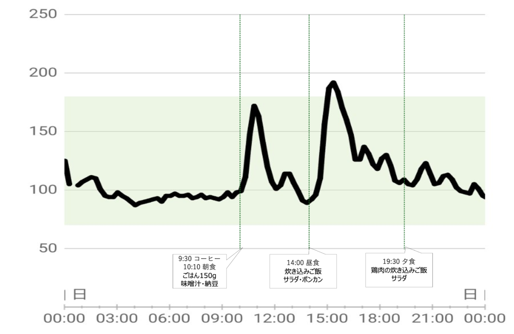 炊き込みごはんにはオリーブオイルも大さじ1入っているし、鶏肉1枚入っているからピュア炭水化物じゃないんだけど、弱っている身体もあいまって、192mg/dLまで上昇です。