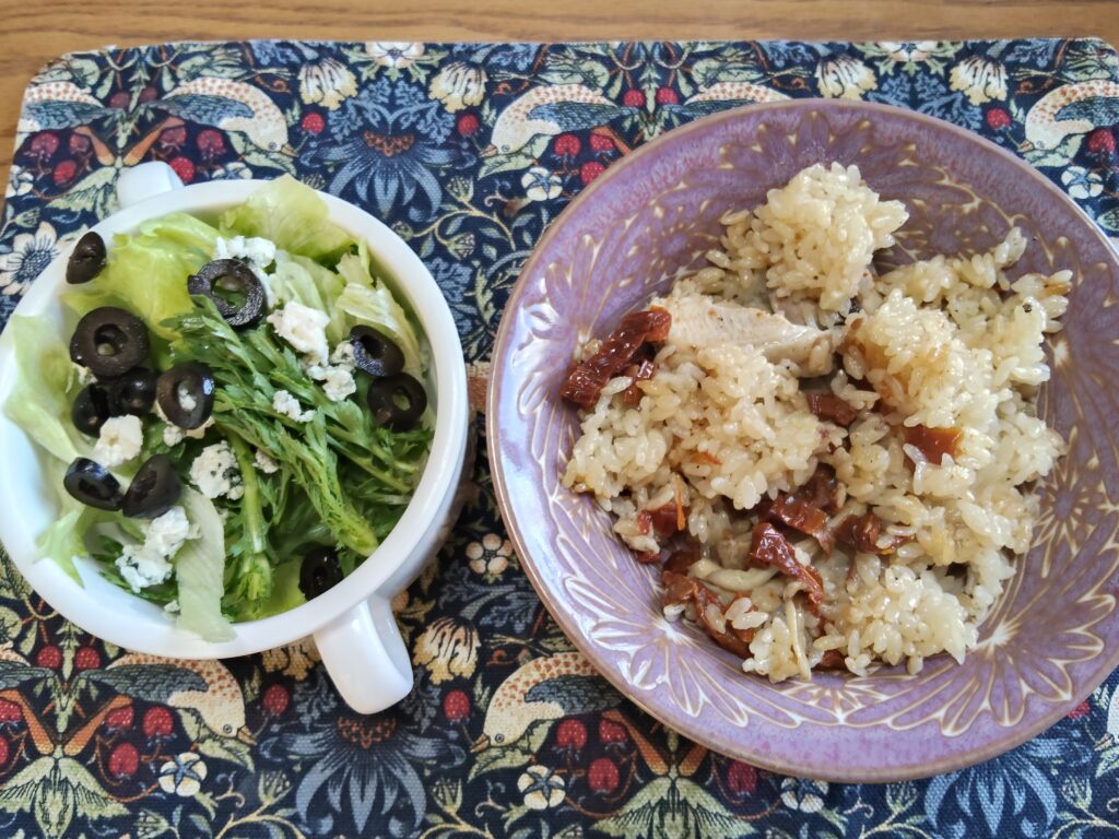 19:30  夕食 ドライトマトと鶏肉の炊き込みご飯、サラダ